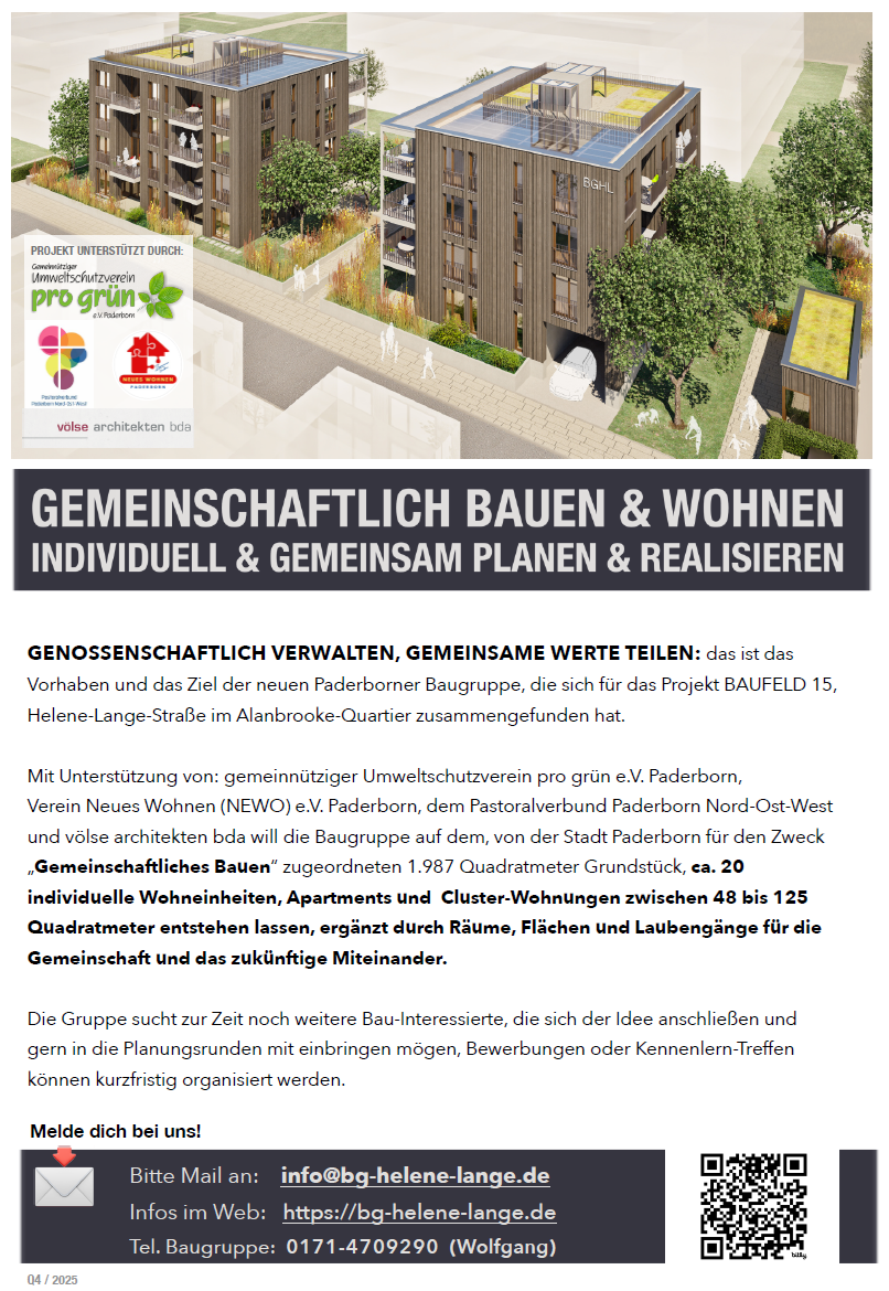 - Am 28. April 2025 wird es ein Treffen aller Interessierten geben im Y-Gebäude der Universität Paderborn. Das Motto lautet „Gemeinschaftliches Bauen und Wohnen, individuell und gemeinsam Planen und Realisieren“. Weitere Infos zur Veranstaltung gibt es hier: http://neu.progruen-paderborn.de/pgpb/gemeinschaftlich-bauen-wohnen-28-04-2025-um-1900-uhr/